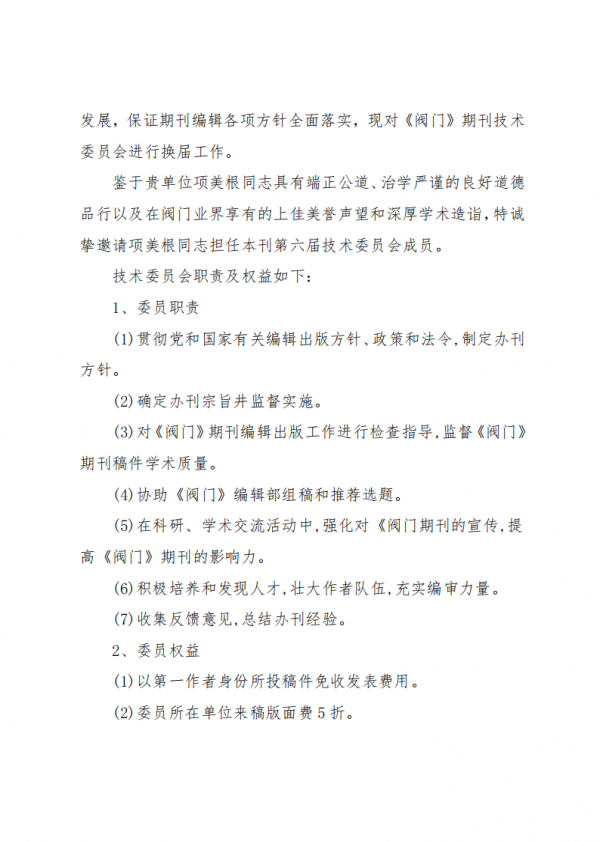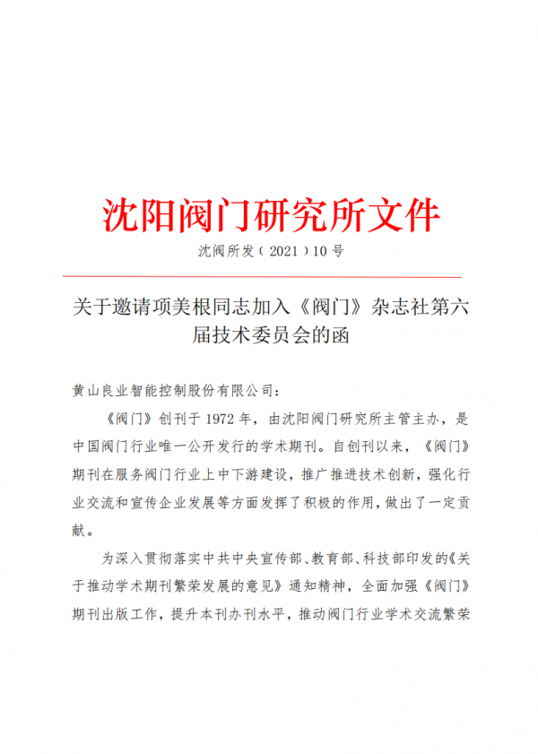 接2021年11月1日《阀门》杂志社邀请函:鉴于黄山良业项美根先生具有端正公道、治学严谨的良好道德品行以及在阀门业界享有的上佳美誉声望和深厚学术造诣,特诚挚邀请项美根同志担任本刊第六届技术委员会成员。