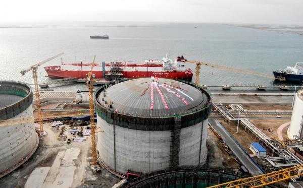 11月15日,由中石化第四建设有限公司承担的国家管网天津液化天然气(LNG)二期项目储罐工程,22万立方米低温储罐4#罐历时140分钟实现气顶升圆满成功。该储罐为国内自主研发设计单罐容量最大的系统外LNG储罐工程,外罐内直径91米,拱高12.192米,拱顶跨度91米,拱顶行程42.395米,重约1050吨。石化四建公司项目部表示,在后续的项目建设中,将以高标准、高质量建设好优质工程,助力国家管网集团天津液化天然气公司为实现双碳目标、构建清洁低碳高效能源体系、带动天津天然气产业发展贡献力量。图为低温储罐正在进行气顶升作业。 (曲照贵 曲晓龙 唐陕峰 摄影报道)