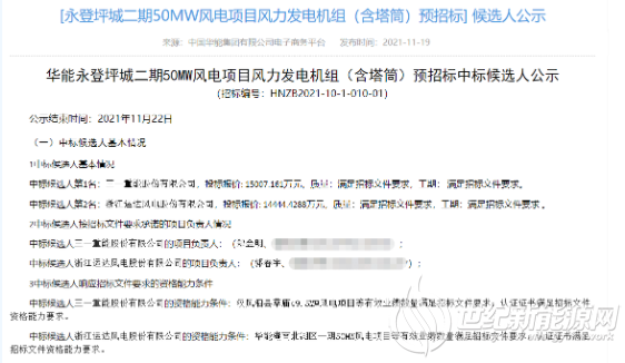 近日,华能永登坪城二期50MW风电项目风力发电机组(含塔筒)预招标中标候选人公示,三一重能预中标50MW,投标报价15007.161万元,折合单价3001元/kW(含塔筒)。?