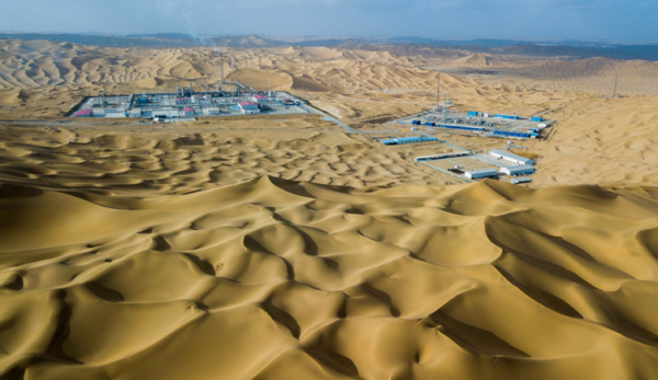 图为地处沙漠腹地的塔里木油田和田河气田处理厂远眺。