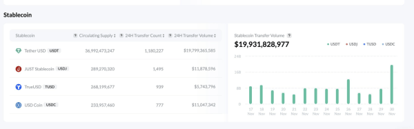 作为行业稳定币赛道上的绝对王者,波场版稳定币近来持续性的火力全开,便直接印证了这一点。据波场官方区块链浏览器TRONSCAN数据显示,11月30日,波场TRON稳定币转账额为199.3亿美元,无限接近200亿美元大关,同时也创下了今年6月以来的新高。而孙宇晨本人也在社交媒体上大赞自家稳定币高效。