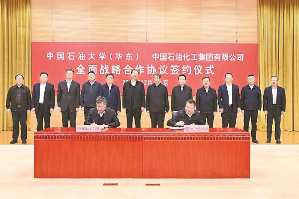 2月14日,中国石化与中国石油大学(华东)签署全面战略合作协议。双方将发挥各自优势,就科技合作、人才培养、人才资源共享、零碳校园建设等方面展开合作。集团公司董事长、党组书记马永生,教育部党组成员、副部长孙尧,中国石油大学(华东)党委书记王勇见证签约。股份公司高级副总裁刘宏斌,中国石油大学(华东)校长郝芳代表双方签约。
