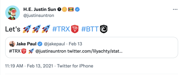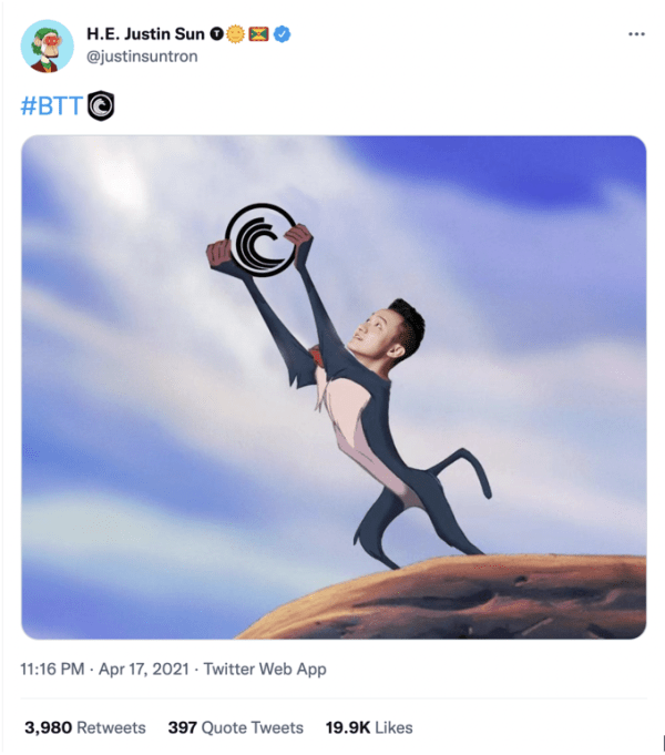 作为狗狗币教主,马斯克高举狗狗币表情包曾风靡币圈。今年4月17日,孙哥也晒出了一张自己高举BTT的表情包,以庆祝?BTT 2个月来2363%的涨幅。如果当时看到这张图的你拍断了大腿,那是因为你错过了孙哥2月份的关键发言:孙哥当时的一句话,直接送TRX和BTT双双坐上火箭。
