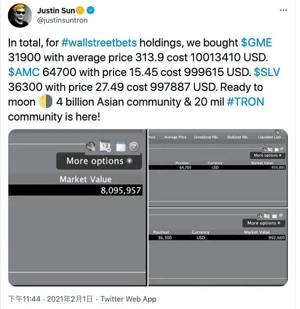 让我们坐着时光机先回到今年年初,彼时,席卷全球的热点事件无疑是美国散户抱团激战华尔街做空机构的“GME”事件。值得一提的是,此次事件中孙哥和马斯克两位大佬纷纷下场表达了对散户的支持。不同的是,马斯克只是动了动嘴皮子,喊出了句“Gamestonk”,而孙哥直接带着真金白银入场,宣布购入10,013,410美元的GME股票和997,887美元的SLV股票,用以支持Wall Street Bets(WSB?)社区。