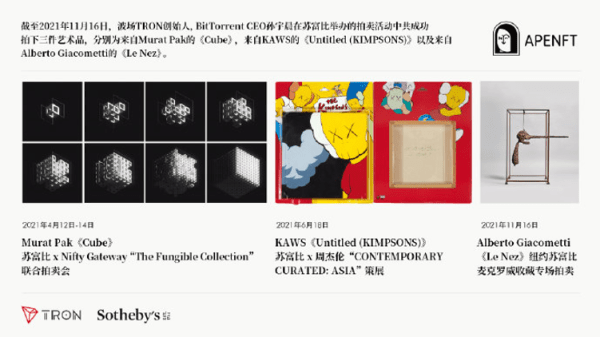 此后,孙哥始终专注于投资顶级艺术家和艺术品,但往往拿到手后还没等捂热,就将它们捐赠了出去。从2000万美元拍下的毕加索名作《戴项链的躺卧裸女》,到200万美元拍下的美国艺术家安迪?沃霍尔的《三幅自画像》,以及569ETH(约合171万美元)拍下的艺术家Mitchell F. Chan创造的NFT作品——《数字空间》(Digital Zones),再到7800余万美金拍下的瑞士国宝级超现实主义艺术家阿尔贝托·贾科梅蒂(Alberto Giacometti)的标志性艺术品《鼻子》,都无一例外地被孙哥赠予APENFT基金会用于艺术创新。可以说,说今年NFT概念的持续火热是拜孙哥所赐,毫不为过。