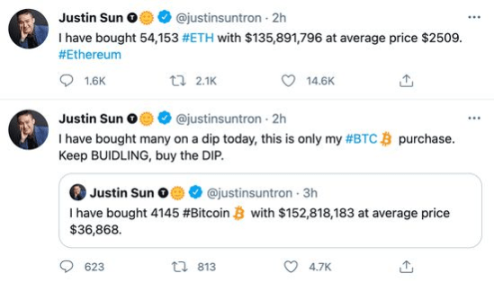 最后,让我们来聊聊大家最喜闻乐见的喊单技术。作为币圈头部话事人,孙哥和马斯克在喊单水平上堪称一时瑜亮。只不过马斯克开着特斯拉乘着SpaceX喊单,触达的圈层更广而已。马斯克的确可以让比特币一小时爆拉5000美金,别忘了,今年5月19日,币圈遭遇至暗时刻,是孙哥豪掷逾2.8亿美元买入比特币和以太坊,化身“护盘使者”成功拯救币圈。锦上添花和雪中送炭,我个人倾向于后者。