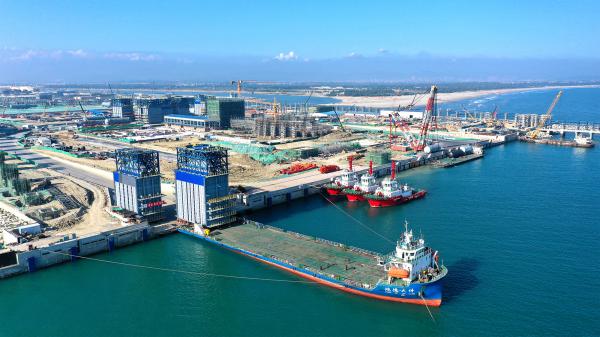 图为中国石油广东石化产品码头正在接卸海运来的大件设备(吴松深/摄)