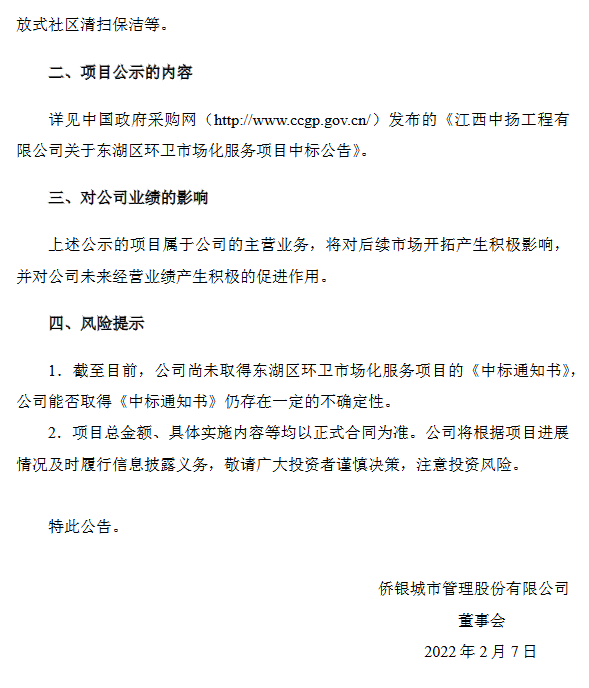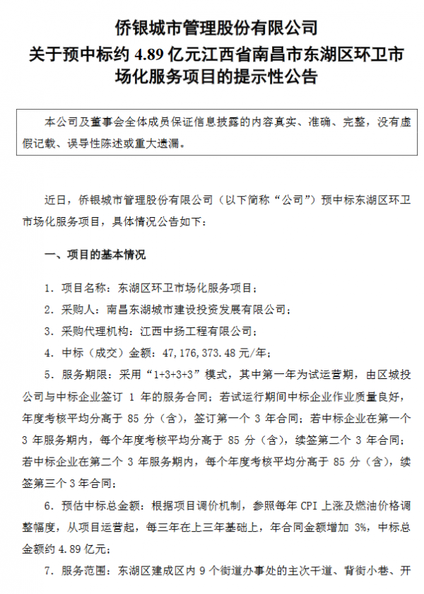 侨银股份公布,公司近日预中标江西省南昌市东湖区环卫市场化服务项目,中标(成交)金额约4717.64万元/年;根据项目调价机制,参照每年CPI上涨及燃油价格调整幅度,从项目运营起,每三年在上三年基础上,年合同金额增加3%,中标总金额约4.89亿元。