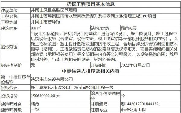 1月28日,江西省井冈山茨坪景区雨污水管网改造提升及挹翠湖水系治理工程EPC项目中标候选人公示发布,第一中标候选人为铁汉生态建设有限公司、中节能铁汉生态环境股份有限公司联合体,投标报价为15063万元,计划工期150日历天。