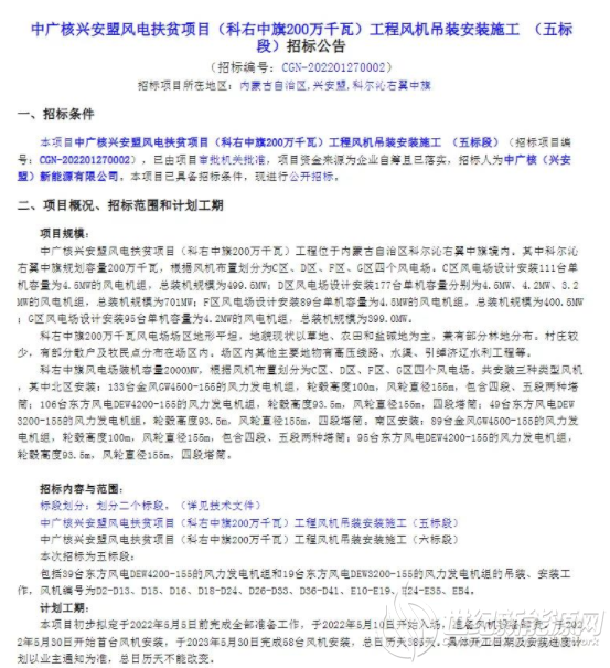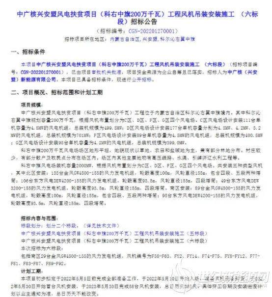 近日,中广核兴安盟风电扶贫项目(科右中旗200万千瓦)工程风机吊装安装施工 (五&六标段)招标。公告显示,五标段:包括39台东方风电DEW4200-155的风力发电机组和19台东方风电DEW3200-155的风力发电机组的吊装、安装工作。六标段:包括南区29台金风GW4500-155的风电机组。详情如下:?
