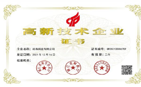 此次被认定为国家高新技术企业既标志着耐森阀业得到了国家相关单位的充分认可,也是对公司长期坚持技术创新和高质量发展的有力诠释。