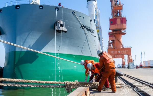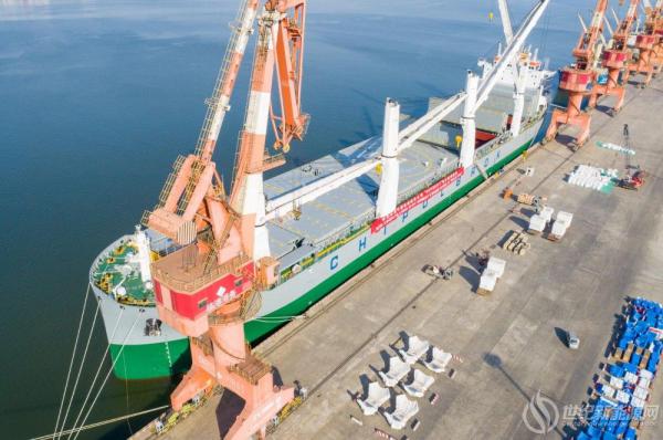 据了解,多用途重吊船“赫贝特”轮载重62000吨,属于新中国第一家中外合资企业中波轮船股份公司。轮船长199.9米,宽32.26米,型深19.3米,满载吃水13.5米,设有5个大开口货舱。货舱舱盖顶面平整,有效装货区域166×30米,相当于14个标准篮球场,满足各类超长大件的装载,同时也可摆放近2000个标准集装箱;船舶舷侧配备4台甲板吊,联吊最大起重能力达300吨,可灵活装卸各种尺寸重大件设备货物,具有适货性佳和工程项目物资承运规模优势,是“散杂兼营”理念的重要支撑。轮船载重货物为风电机舱、轮毂和风电主机配件,共计174件,总计3056立方米。