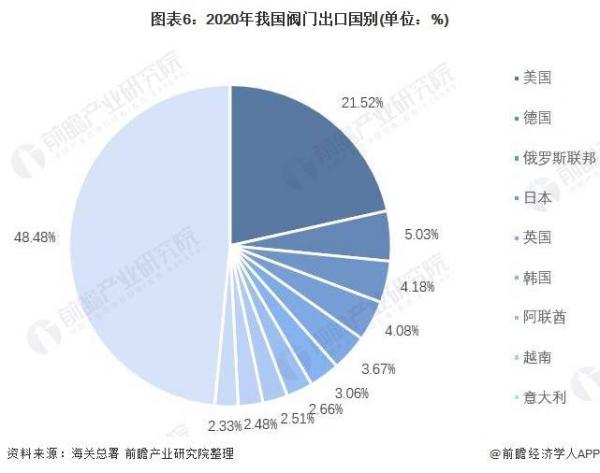 根据海关总署数据显示,2020年我国阀门主要出口国前三位分别为美国、德国和俄罗斯联邦。2020年全年,我国销往美国、德国与俄罗斯的阀门价值总计为49.31亿美元,占总出口额的30.73%。与我国阀门进口状况不同,在阀门出口方面,仅有出口至美国的阀门金额占比较高超过了20%,出口至其他国家的金额占比均在10%以下。我国阀门出口国家中,排名前十的国家分别为美国、德国、俄罗斯联邦、日本、英国、韩国、阿联酋、越南、意大利和墨西哥,2020年我国向前十个国家的出口金额总计82.67亿美元,占总出口金额的51.52%。
