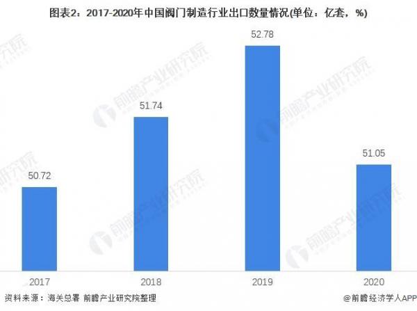 从出口数量来看,2017年来,我国阀门出口数量基本保持不变,2020年全年出口51.05亿套,同比下降3.27%。