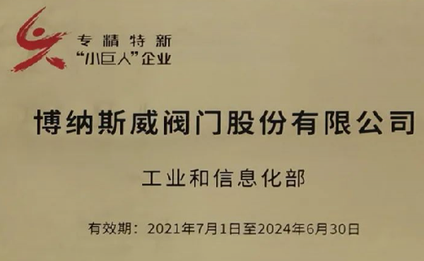 博纳斯威阀门股份有限公司坚持创新驱动发展,技术革新产品,多年来致力于研究“专精特新”产品。从最早认定为天津市“专精特新”产品、天津市专精特新中小企业到如今荣膺国家级专精特新“小巨人”企业,一步步见证了公司的成长与发展,突破与创新。?? 也标志着博纳斯威在科技创新能力、关键核心技术、市场占有率、经济效益等方面不仅得到行业的高度肯定,更是获得了国家认可。