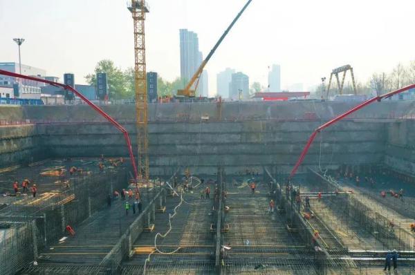 本次浇筑的深基坑底板浇筑位置为2#箱体雨水调蓄池【2-9】区块,混凝土总需求量为650m?,完成后底板厚度可达900cm,起到支撑坑底部位、约束围护桩等效果。