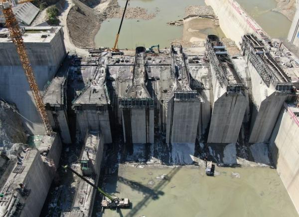 近日,黄金峡水利枢纽工程表孔坝段溢流面全线浇筑至设计高程。