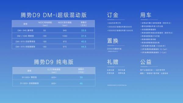 同时,腾势针对D9推出丰富的臻享豪华预定权益,预售期间下订D9的用户,可臻享多项豪华预定权益:权益一:享3档订车模式,让用户零风险享受大额现金权益。权益二:享4大用车保障,和5大智联在线,确保用户后期用车无忧。权益三:置换D9新车享20000元置换补贴,以最大诚意回馈每一位忠实用户。权益四:大礼随处可见,订车礼盒拿到手软。权益五:成功支付意向金的用户,可共同参与品牌各类公益活动项目。