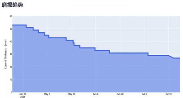 2021年4月20日安装了一套智能磨损在线监测系统于某选厂300NZJA渣浆泵前护板上,运行了3.5个月后,橡胶剩余厚度27mm,监测数值与实际厚度完全一致。