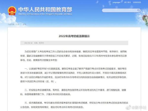 为切实保障广大考生和考试工作人员的生命安全和身体健康,确保2022年全国高考平稳、有序举行,按照教育部、国家卫生健康委关于高考防疫工作的有关要求,近期,各地已陆续向2022年高考考生发布参加高考的注意事项。在此,教育部再次提醒全体考生: