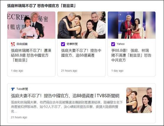此前,张庭、林瑞阳夫妇因从事传销活动被大陆有关部门调查处罚,二人及旗下公司共计20亿元资产被查封。但在24日,多家台媒密集报道了二人于近日提起复议,这些报道指控有关部门对二人的处罚措施是“针对台商”、“割韭菜”。