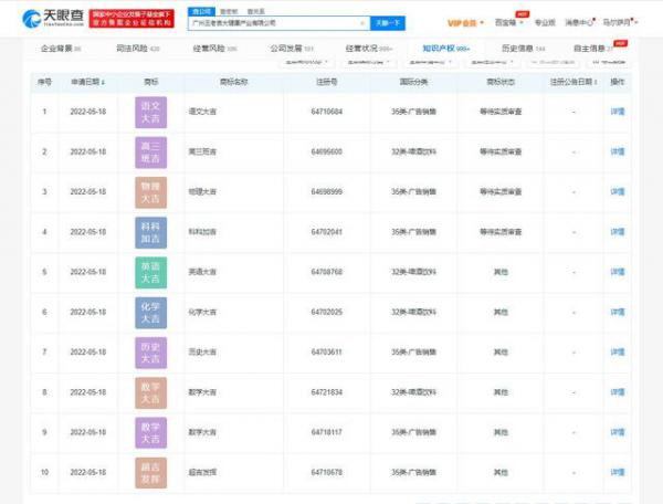 天眼查App显示,近日,广州王老吉大健康产业有限公司申请注册多个高考相关商标,包括“高三班吉”“万试大吉”“超吉发挥”“科科加吉”“语文大吉”“数学大吉”“英语大吉”等,国际分类为广告销售、啤酒饮料等,目前商标状态多为等待实质审查。