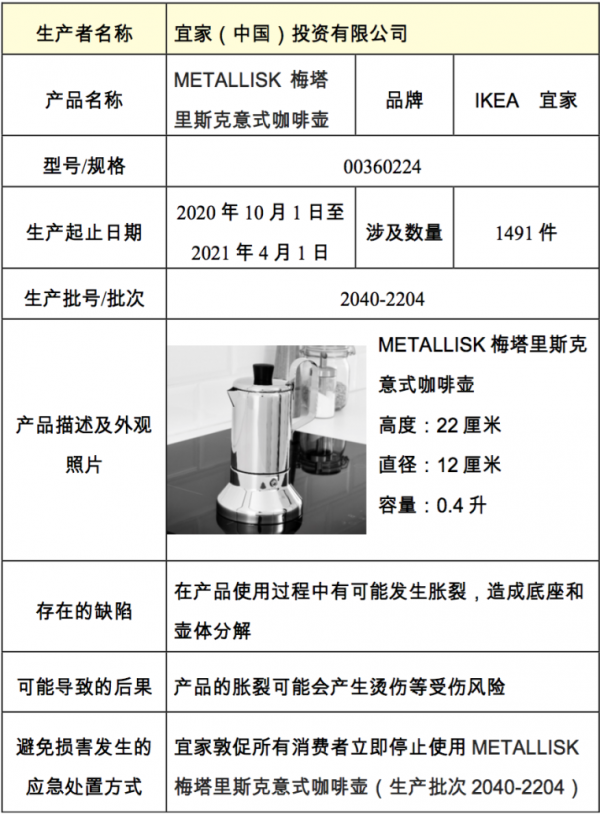 九派财经讯 6月8日,上海市场监督管理局发布信息,因在产品使用过程中有可能发生胀裂,造成底座和壶体分解,可能会产生烫伤等受伤风险,宜家(中国)将召回1491件METALLISK 梅塔里斯克意式咖啡壶。