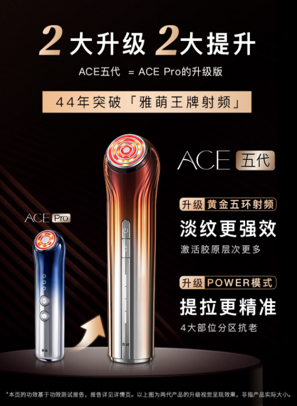 此次发布的新品——雅萌ACE 五代射频仪主打“精准淡纹,强效提拉”,较上一代ACE PRO而言,抗老技术主要在POWER模式、RF环形圆极复合技术、变频射频等3方面做了迭代升级,从而有效实现淡纹更精准,提拉更强效。