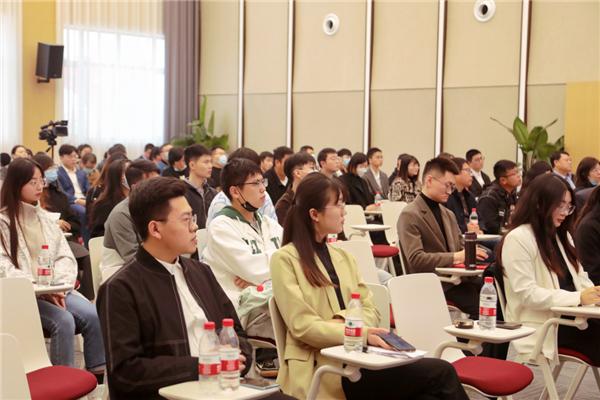 11月20日,扬子江学堂的讲台中央,一名员工正拿着一份红色的纸质文件向在场观众展示。他声音慷慨激昂,满脸的骄傲与自豪。