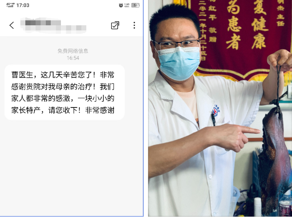 赖阿姨的女儿说:妈妈因为血栓在当地医院开过刀,住了好几次院都没有治好,辗转来到川蜀,做了置管溶栓后现在已经恢复的差不多了,妈妈为了这个病真的受了很多苦,自己每每想起都会泪流满面,现在非常感谢曹医生,感谢川蜀所有的医护人员,只有托人从老家雅安寄来自己亲手做的特产才足以表达自己真挚的谢意,待母亲完全康复定会做一面锦旗送给川蜀,也会把川蜀的技术服务分享给所有被病痛折磨的人