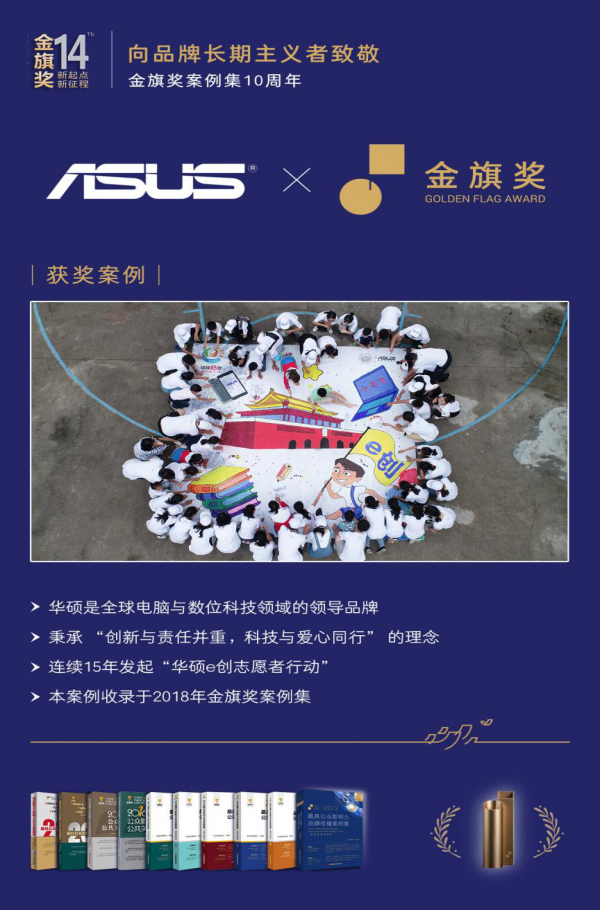 自2009年起,华硕携手中国科协发起“华硕e创志愿者行动”,已持续运营15年。鼓励当代大学生积极投身社会公益,通过IT及互联网科技等创新手段,返乡、支边、公益创业创新创富,为缩小城乡数字鸿沟,加快城镇一体化建设贡献力量。该案例获得2018金旗奖企业社会责任大奖,收录于2018金旗奖案例集。