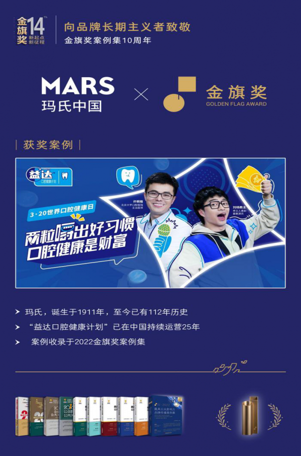 玛氏公司在中国实施25年的“益达口腔健康计划”持续助力科普口腔健康知识,帮助更多人养成健康好习惯,收获自信的微笑。得到社会大众、媒体以及官方的认可与支持,实现了公益与企业传播的双向发展。该案例获得2022金旗奖最具影响力企业公关传播金奖,收录于2022金旗奖案例集。