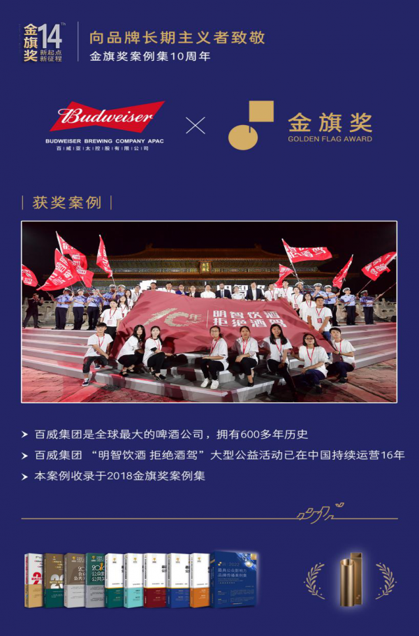 百威集团“明智饮酒 拒绝酒驾”大型公益活动已在中国持续运营16年,联合各地政府、交警部门、中国酒业协会以及社会知名的公益人士,通过全方位渠道向消费者倡导明智饮酒,拒绝酒驾。该案例获得2018金旗奖公关活动大奖,收录于2018金旗奖案例集。