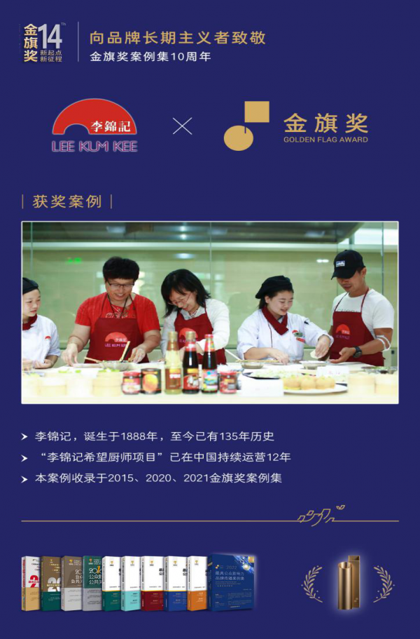 李锦记自2011年启动“李锦记希望厨师项目”,资助有志青年免费学厨圆梦、为中餐业发展培养未来之星,是李锦记“思利及人”的核心价值观和“发扬中华优秀饮食文化”的企业使命的重要实践。该项目已持续运营12年,使李锦记在社会各界树立了良好企业公民形象。该案例获得2015金旗奖杰出奖、2020金旗奖全场大奖、2021金旗奖企业社会责任大奖,收录于2015、2020、2021金旗奖案例集。