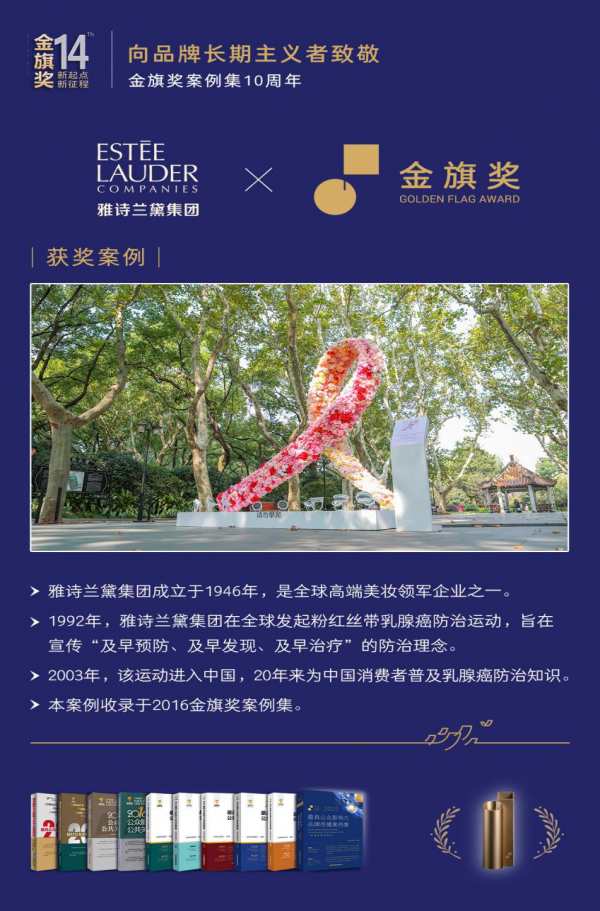 雅诗兰黛集团成立于1946年,是世界领先的优质护肤品化妆品、香水和护发产品的制造商和营销商,也是全球著名奢侈品和高端品牌的管理商。1992年,雅诗兰黛集团在全球发起粉红丝带乳腺癌防治运动,旨在宣传“及早预防、及早发现、及早治疗”的防治理念。2003年,该运动进入中国,积极通过各种方式宣传推广乳腺癌防治。雅诗兰黛集团积极与各政府部门、医疗机构和媒体平台合作,致力于疾病的研究宣教;同时,也积极为乳腺癌患者提供力所能及的经济援助。该案例获2016金旗奖企业社会责任大奖,收录于2016金旗奖案例集。
