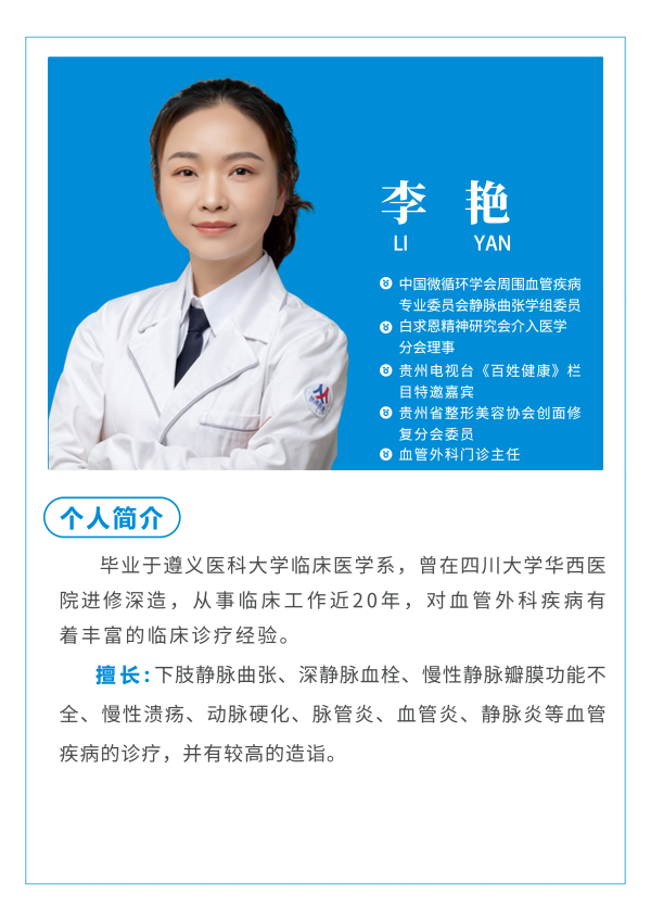 李艳,女,毕业于遵义医科大学临床医学系,曾在四川大学华西医院进修深造,从事临床工作近20年,对血管外科疾病有着丰富的临床诊疗经验,曾受邀出席第三届西部下肢血管疾病论坛。李艳医生擅长下肢静脉曲张、深静脉血栓、慢性静脉瓣膜功能不全、慢性溃疡、动脉硬化、脉管炎、 血管炎、静脉炎等血管疾病的诊疗,并有较高的造诣。