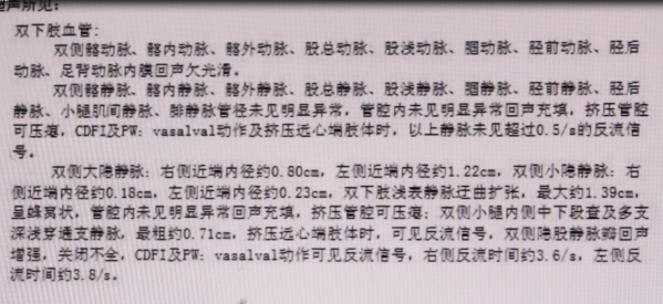 李艳医生又给潘大姐两条小腿都做了一个多功能彩超,彩超结果显示双侧的大隐静脉都有扩张,近端左侧更为严重,扩张程度为1.22cm,表浅的血管最大管径达到了1.39cm,另外,通过彩超发现,她的穿通支也有扩张,最后结合体格检查和彩超检查诊断,患者的静脉曲张达到了C4期。