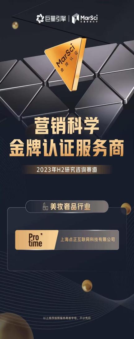 值得强调的是,这是巨量引擎营销科学首*次遴选研究咨询赛道金*牌服务商,点正科技能够一击即中,摘得首批金*牌服务商荣誉,是因为点正科技不仅用营销数据专业高效地解决客户当下的问题。