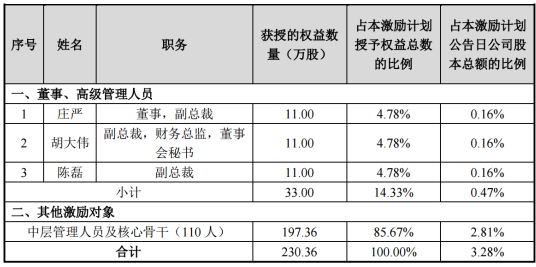 按照股权激励计划,本次限制性股票的授予价格为21.01元/股;高管及董事在此次股权激励中获授股票总额33万股,占本次股权激励总额的14.33%,占公司股本总额的0.47%。中层管理人员及核心骨干110人,获授股票总额为197.36万股,占本次股权激励总额85.67%,占公司股本总额的2.81%。