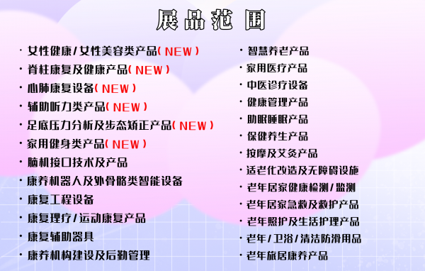 值得关注的是,为助力大健康产业细分领域快速发展,2024年CRS、CECN、Life Care现场,主办方将基于行业热点及市场需求,创新推出女性健康展区、辅助听力展区、脊柱康复与健康展区、心肺康复展区、家用健身展区、足底压力分析及步态矫正展区,助力行业打通医康养护全产业链布局,助推行业快速发展。