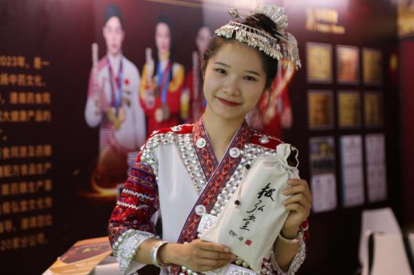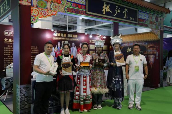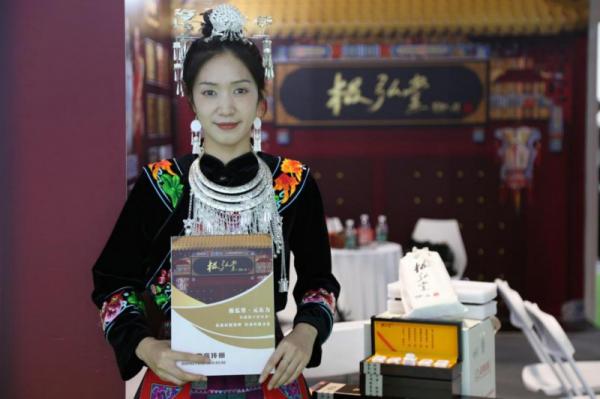 在500多家参展商中,极弘堂展厅以其独具风格的红色国风主题装修脱颖而出,使其在现场格外引人注目。展厅以中国故宫元素为设计灵感,巧妙运用红墙、黄瓦、雕梁画栋等元素,彰显品牌气度和高雅格调,为现场宾客带来了恢宏壮丽的视觉享受,展厅内,工作人员身穿绣花苗族服装,头戴银饰,热情地接待着现场的宾客,展示着苗族人民独特的风采。