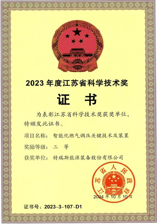近日,在江苏省科技大会暨科学技术奖励大会上,由特瑞斯公司牵头的“智能燃气调压关键技术及设备”项目荣获2023年度江苏省科学技术奖三等奖。这一荣誉不仅展现了特瑞斯在技术创新领域的卓越成就,也进一步巩固了其在燃气行业的*地位。