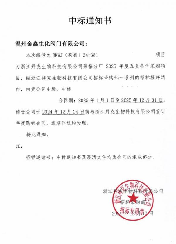 2024年12月17日,温州金鑫生化阀门有限公司在激烈的竞标中脱颖而出,成功中标浙江拜克生物科技有限公司2025年度五金备件采购项目。这一成就不仅彰显了公司在行业中的竞争力,也进一步巩固了品牌在市场中的影响力。