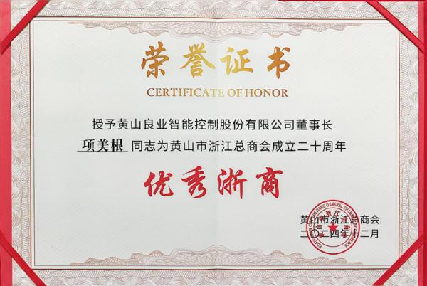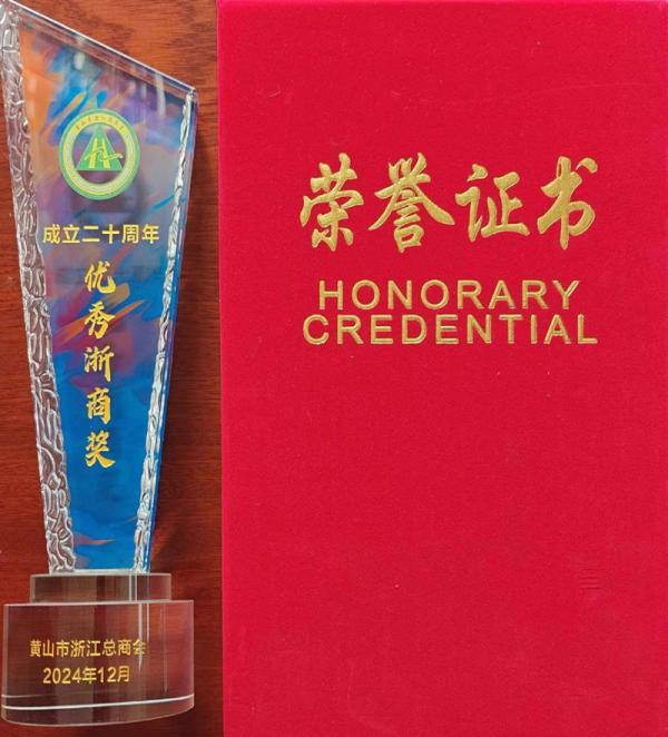 2024年12月18日下午,黄山市浙江商会五届三次会员代表大会暨成立二十周年庆典,在黄山香茗酒店二楼“云海厅”隆重召开。大会由肖红霞执行会长主持,审议通过陈富标会长工作报告和胡罡监事会主席财务工作报告,宣贯黄山市浙江商会《关于黄山市浙江总商会成立二十周年表彰优秀浙商通报》(黄浙商字[2024]8号)。“黄山市杰出浙商”(5名)、“黄山市优秀浙商”(20名))”在所表彰的二十位黄山市优秀浙商中,我公司终身名誉董事长项美根先生位列榜首,获此殊荣。