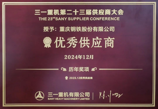 近日,在三一重机第23届供应商大会上,重庆钢铁荣获了“三一重机优秀供应商”称号。这一殊荣标志着重庆钢铁在为三一重机提供高品质产品和优质服务方面的持续努力与成效。