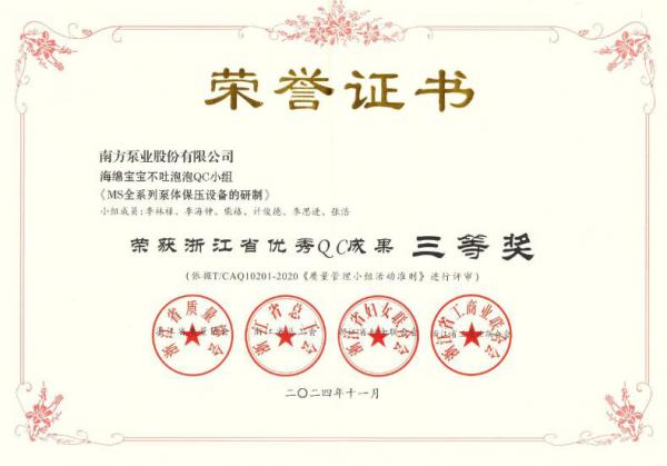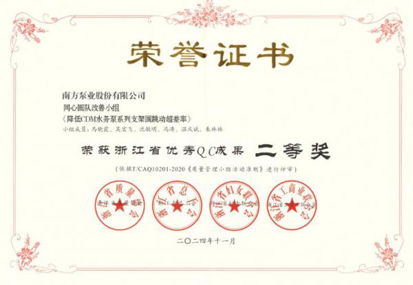 近日,2024年浙江省“优秀QC成果”评选结果正式公布,中金环境旗下的南方泵业公司在此次评选中获得了不小的成就,其参赛的两项QC项目分别荣获浙江省优秀QC成果二等奖和三等奖。这一荣誉不仅展示了南方泵业在质量管理上的突出成果,也进一步巩固了其在泵业领域的*地位。