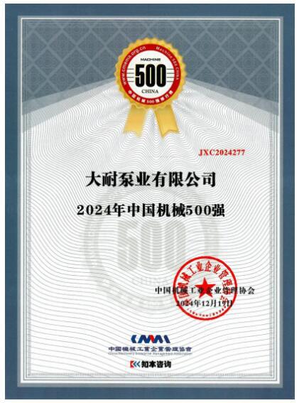 2024年,中国机械工业企业管理协会发布的《中国机械500强》研究报告在成都举行,会议隆重揭晓了各大行业*企业的年度排名。大耐泵业有限公司凭借卓越的业绩和持续创新,再次荣登中国机械500强榜单,并继续蝉联这一荣誉。