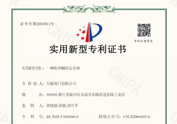 随着此次“防冲刷安全阀”专利的成功授权,万能阀门有限公司在高性能安全阀制造领域再添砝码。企业相关负责人表示,未来将继续加大在材料工程、结构创新、智能控制等方向的投入,不断推出契合高端制造需求的新一代安全阀产品,为推动工业装备安全保障体系建设贡献更大力量。