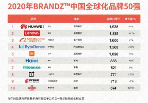 2020年BrandZ中国全球化品牌五十强:有涨有跌