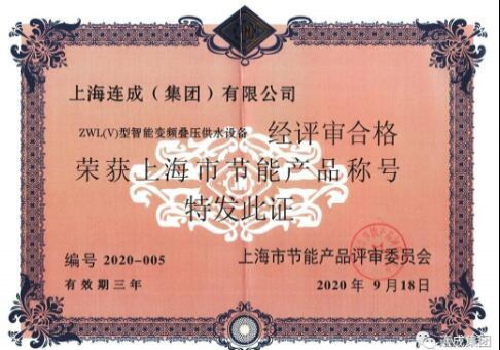 连成集团“ ZWL(V)型智能变频叠压供水设备”荣获“上海市节能产品”称号